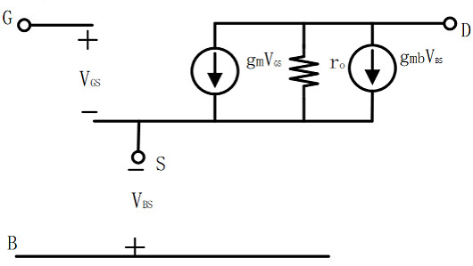 3. 考慮襯底偏置效應(yīng)(體效應(yīng)) 前面我們提到,MOSFET是一個(gè)四端器件,通常將襯底和源極相連作為三端器件使用,但是考慮體效應(yīng)時(shí),$V_{BS}$會(huì)對(duì)漏電流產(chǎn)生影響,廣義上來(lái)看,襯底起到了MOSFET另一個(gè)柵的作用,類似的用一個(gè)壓控電流源對(duì)其產(chǎn)生的影響進(jìn)行模擬,其等效模型如下圖: