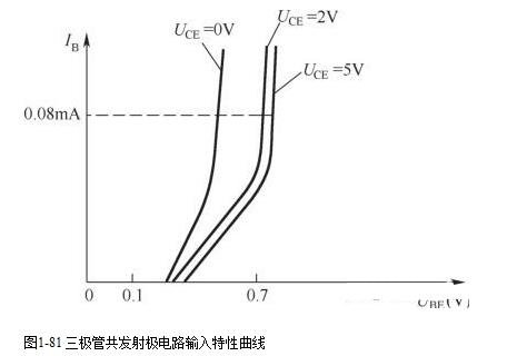 三極管輸入特性曲線,三極管輸出特性曲線介紹圖1-81所示是某型號三極管共發射極電路輸入特性曲線。圖中,x軸為發射結的正向偏置電壓大小,對